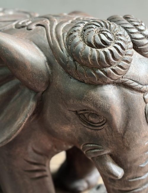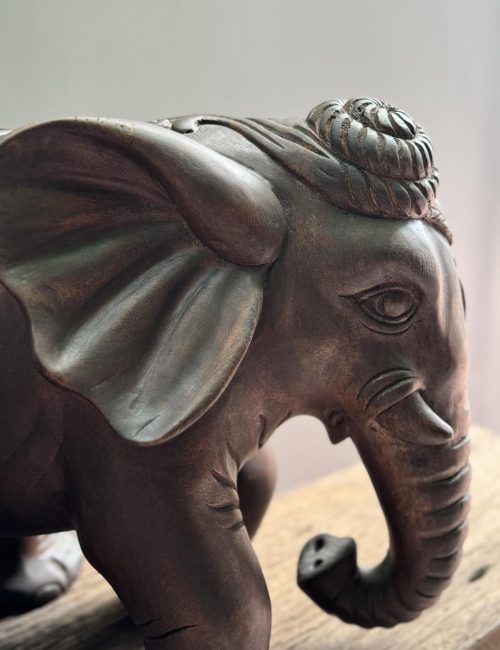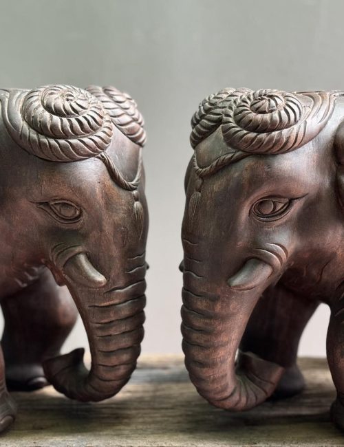 Hand-carved from natural solid wood, this pair of elephant sculptures symbolizes wisdom, strength, and prosperity. With elegant patterns and refined details, the elephants are perfect statement pieces for cultural décor, while also carrying auspicious meanings in many traditions.