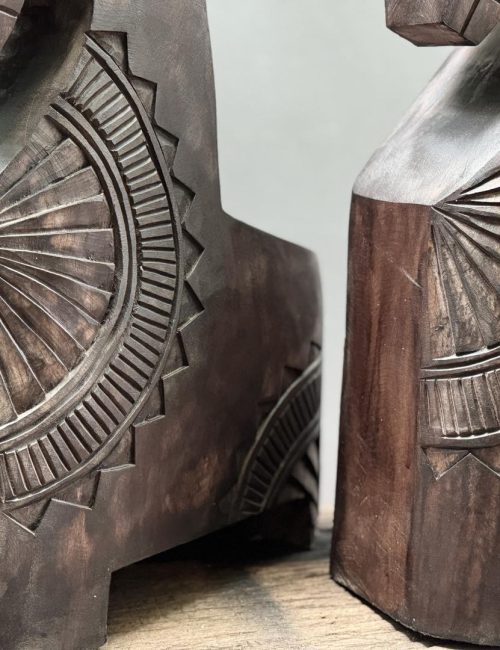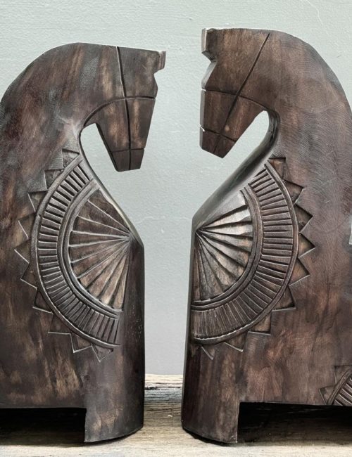 Hand-carved from natural solid wood, this pair of horse sculptures blends minimalism with cultural symbolism. The bold geometric lines and intricate fan-pattern carvings create a powerful yet timeless presence for any interior space.