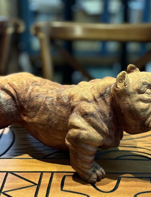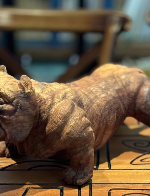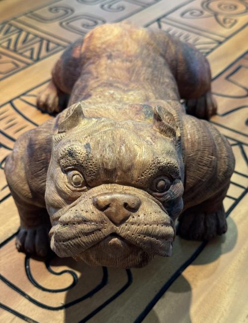 Hand-carved from natural solid wood, this bulldog sculpture embodies strength, loyalty, and resilience. With its muscular body, expressive face, and lifelike details, the piece conveys both toughness and warmth. A symbol of protection and steadfast companionship, it makes a unique decorative accent full of character.