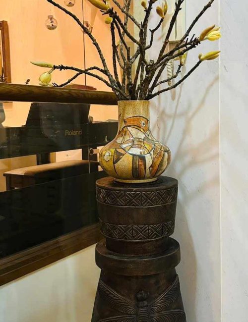 With its rustic yet refined design, it serves both as a decorative accent and a functional stand for vases, plants, or art pieces.