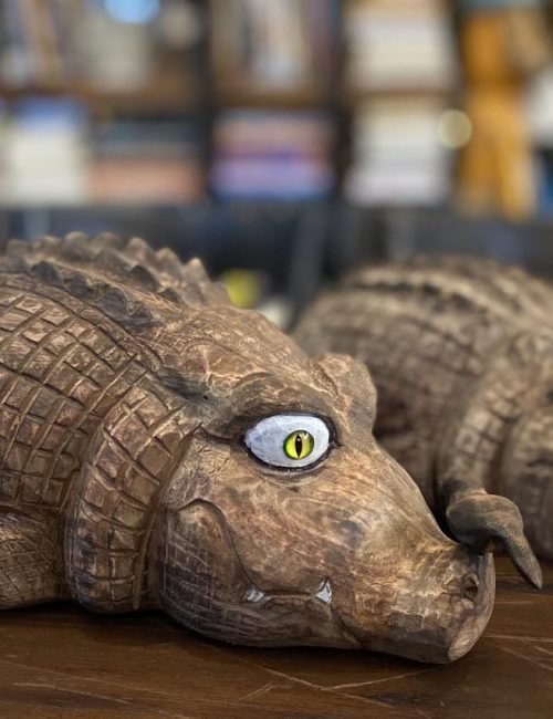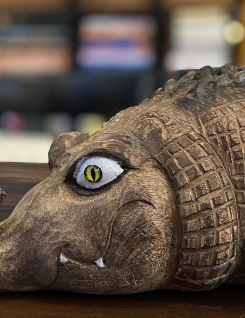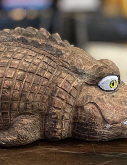 Hand-carved from natural solid wood, this crocodile sculpture captures both playfulness and detail. With its textured scales, expressive eyes, and a small bird companion, the piece reflects harmony between nature and wildlife. Perfect as a decorative accent, art collectible, or a meaningful gift.