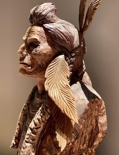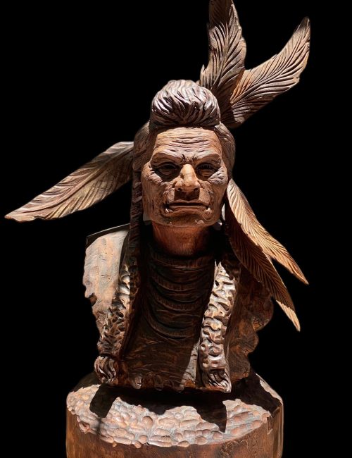 Hand-carved from natural solid wood, this sculpture of a native warrior reflects strength, heritage, and timeless artistry. The detailed facial expression, traditional attire, and feather headdress are masterfully carved, making this piece a powerful representation of cultural identity and craftsmanship.