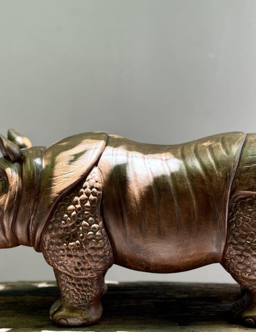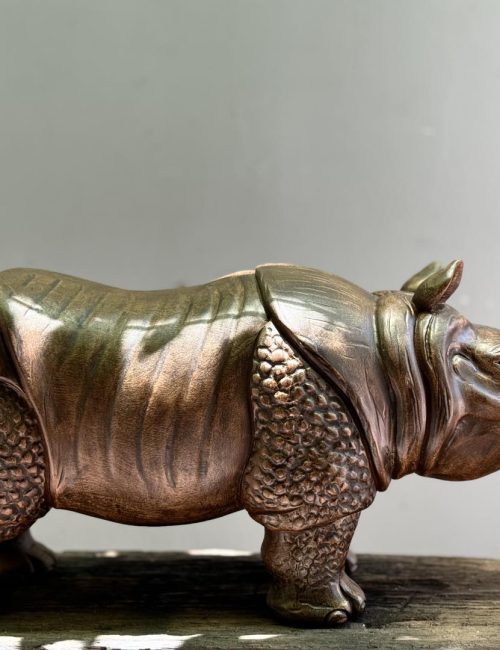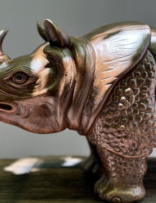 Hand-carved from natural solid wood, this rhinoceros sculpture highlights the majestic strength and resilience of one of nature’s most powerful creatures. Detailed textures on its skin and lifelike features emphasize artisanal craftsmanship, making it a bold centerpiece for art collections, cultural displays, or interior décor.