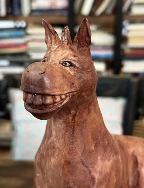 Hand-carved from natural solid wood, this smiling horse sculpture brings a whimsical and joyful presence to any space. With its playful expression, detailed carving, and rustic finish, the piece combines humor and artistry, making it a unique decorative accent or an original gift.