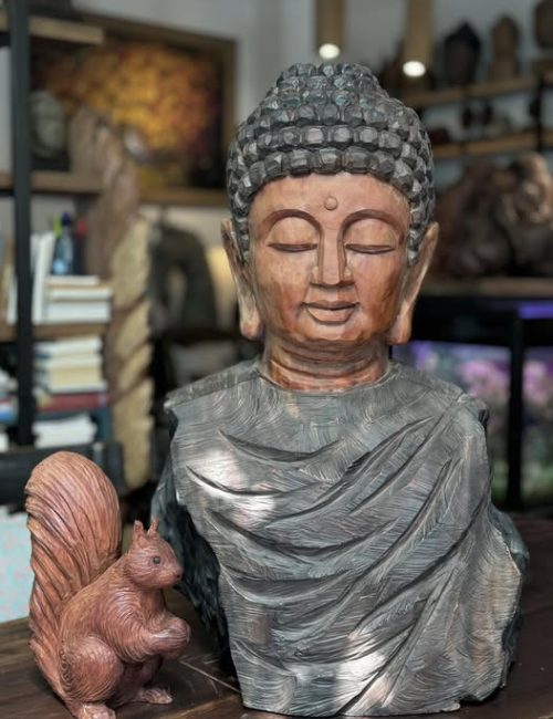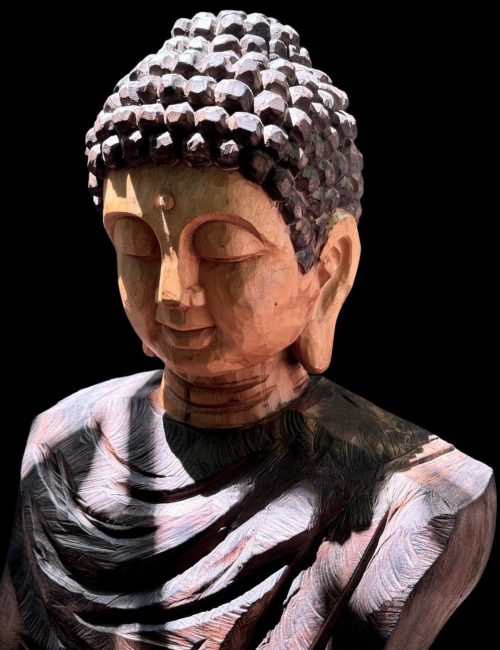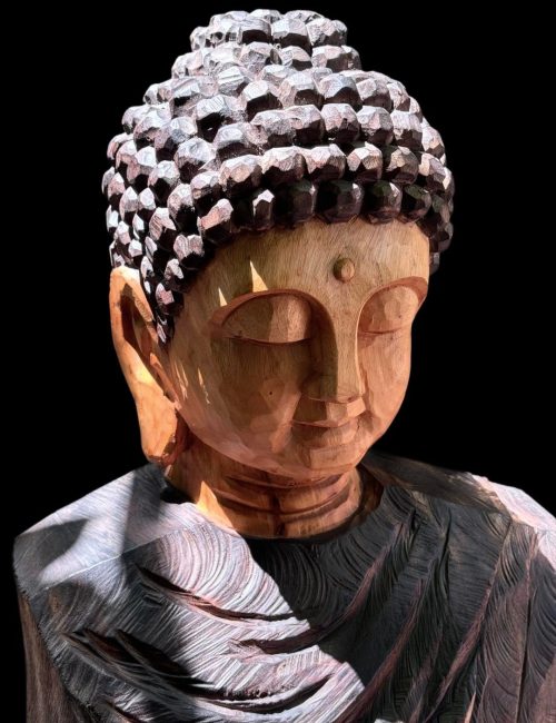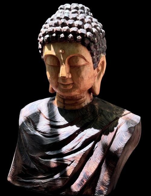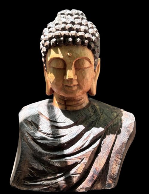 Hand-carved from natural solid wood, this Buddha sculpture radiates peace, serenity, and spiritual grace. The finely detailed facial features and the flowing robe texture highlight artisanal craftsmanship, making it a sacred and elegant centerpiece for meditation spaces, art collections, or refined interior décor.
